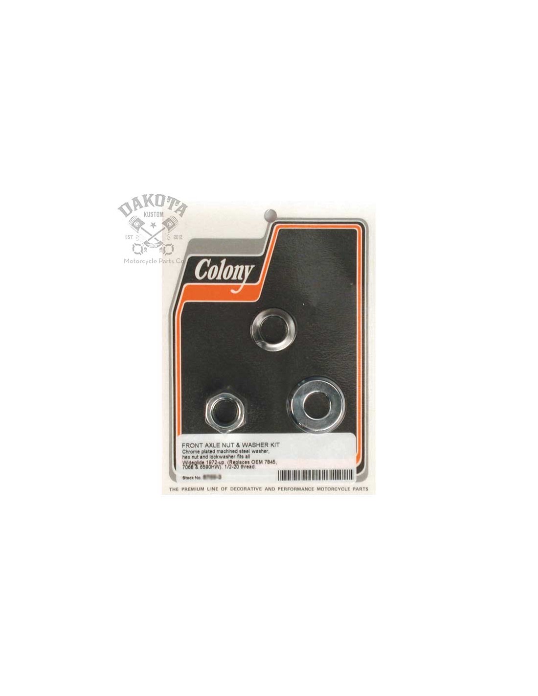 Juego de tuerca y arandelas de acero cromadas para el eje delantero con rosca de 1/2"-20. Apto para los modelos Harley-Davidson FL y FXWG Wide Glide a partir de 1973. Referencia Colony 8769-3. Referencias originales Harley-Davidson 7845, 7068 y 6590HW.