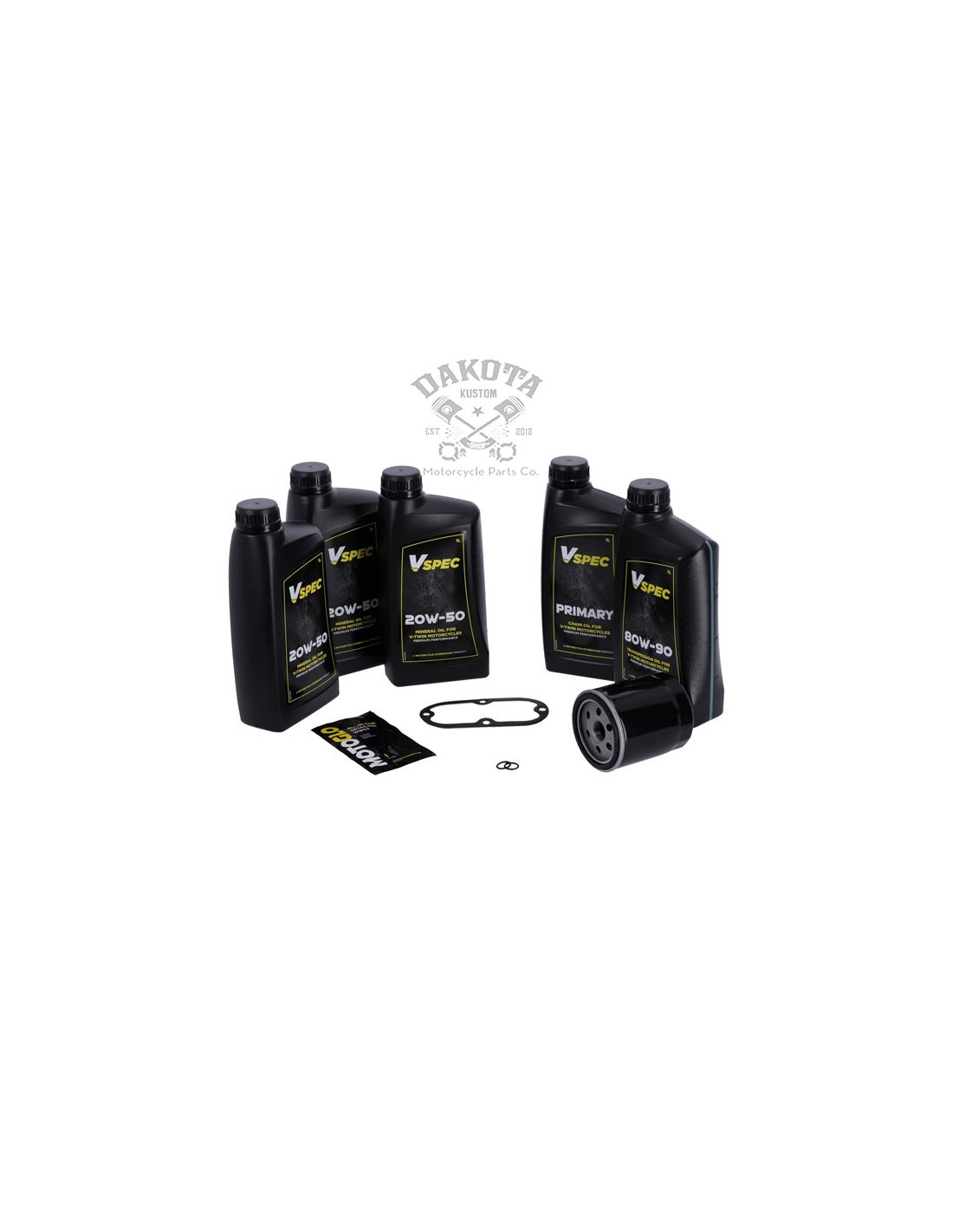 Kit aceite mineral del fabricante VSPEC para realizar el cambio de aceite de motor. Incluye: 3 litros de aceite de motor mineral SAE 20W50, filtro de aceite negro 63805-80A, 1 litro de aceite de caja primaria, 1 litro de aceite de transmisión 80W90, junta de tapa de inspección 60567-65B/60567-90C, junta tórica del tapón de drenaje 11105. Aceite de motor mineral SAE 20W50 multigrado Vspec de calidad para motos que requieren aceite de motor mineral. Cumple o supera JASO MA/2. Apto para todos los modelos Harley-Davidson Softail 1984-1998