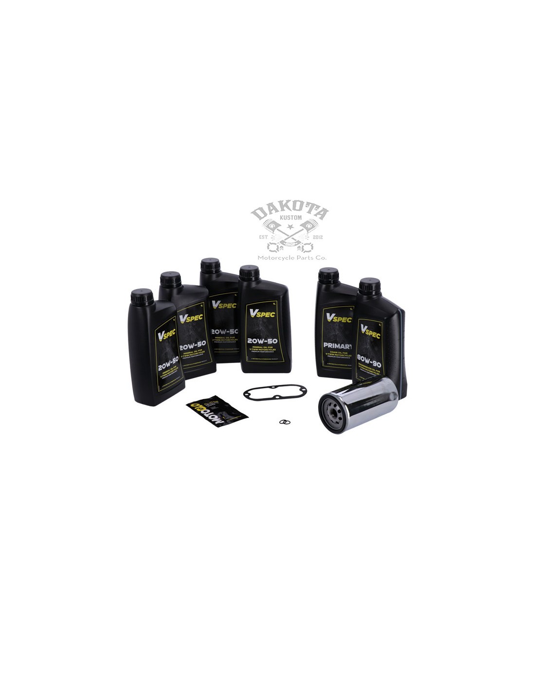 Kit aceite mineral del fabricante VSPEC para realizar el cambio de aceite de motor. Incluye: 4 litros de aceite de motor mineral SAE 20W50, filtro de aceite cromado extralargo 63813-90 (como de serie), 1 litro de aceite de caja primaria, 1 litro de aceite de transmisión 80W90, junta de tapa de inspección 60567-65B / 60567-90C, junta tórica tapón de drenaje 11105. Aceite de motor mineral SAE 20W50 multigrado Vspec de calidad para motos que requieren aceite de motor mineral. Cumple o supera JASO MA/2... Apto para todos los modelos Harley-Davidson Dyna 1991-1998.