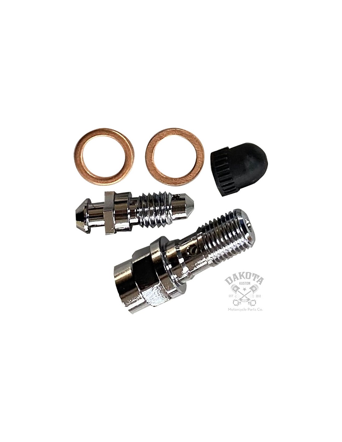 Tornillo Banjo de estilo original. Este kit incluye 1 tornillo banjo, 1 tornillo purgador, 1 tapón guardapolvos y dos juntas de cobre. Apto para modelos Harley-Davidson Touring 2008-2013 y 2015-2025. Referencia original Harley-Davidson 4175206A y 5431A.